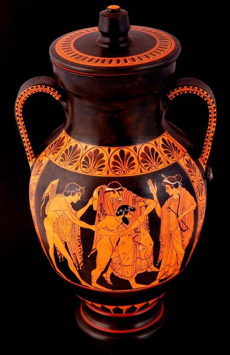 Greek pottery in the classical period is divided in three categories: black figured greek pottery, red figured greek pottery and white background greek pottery.